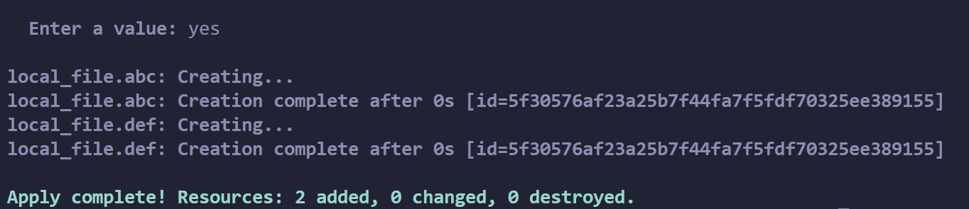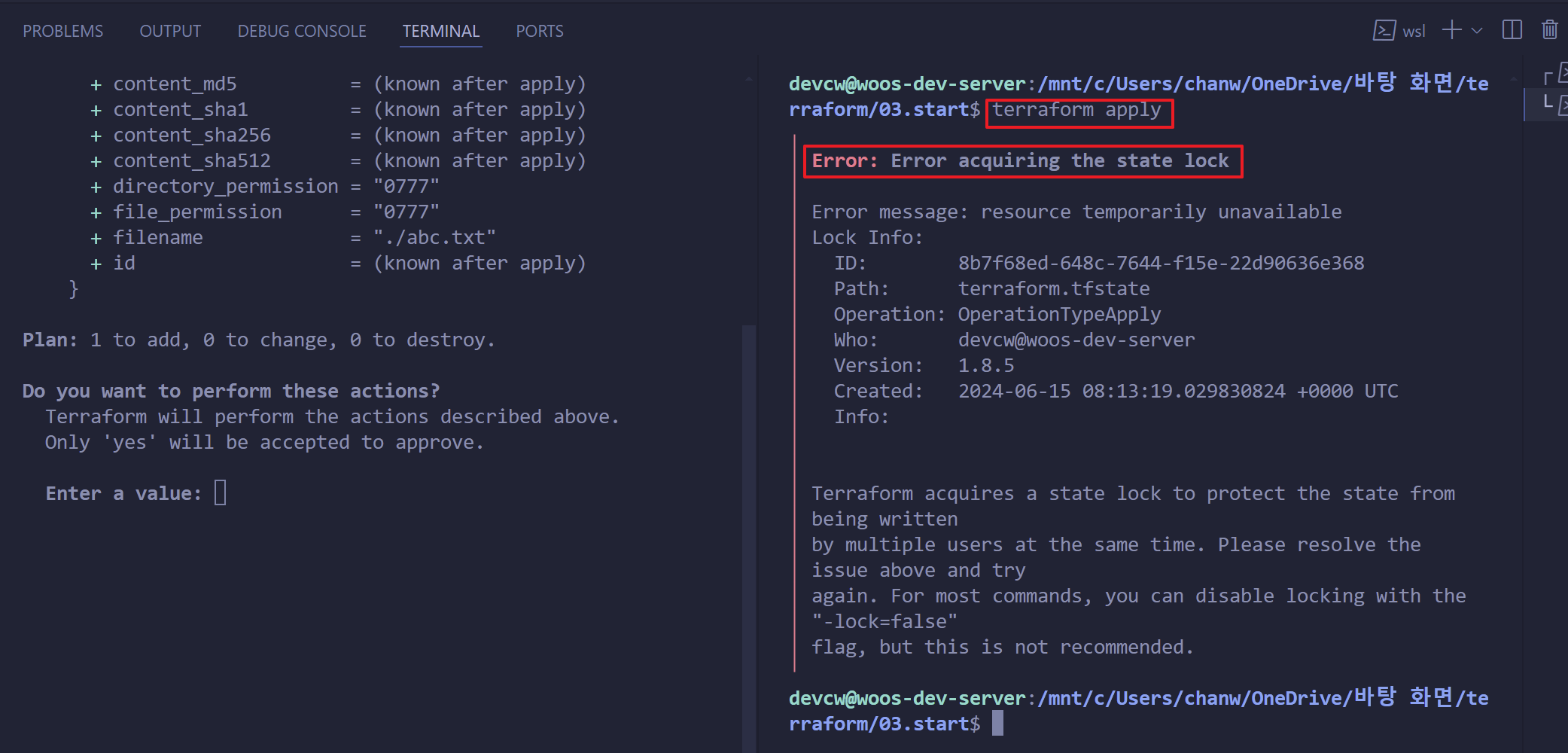 - ๋ ๋ฒ์งธ๋ก ์คํํ terraform apply ์์๋ ๋ค๋ฅธ ํ ๋ผํผ ์คํ์ผ๋ก state๊ฐ ์ ๊ฒผ๋ค๊ณ ๋ํ๋๋ค.