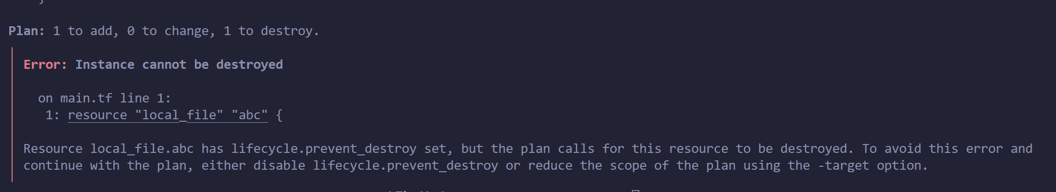 - prevent_destroy (bool): ํด๋น ๋ฆฌ์์ค๋ฅผ ์ญ์ Destroy ํ๋ ค ํ ๋ ๋ช ์์ ์ผ๋ก ๊ฑฐ๋ถ
