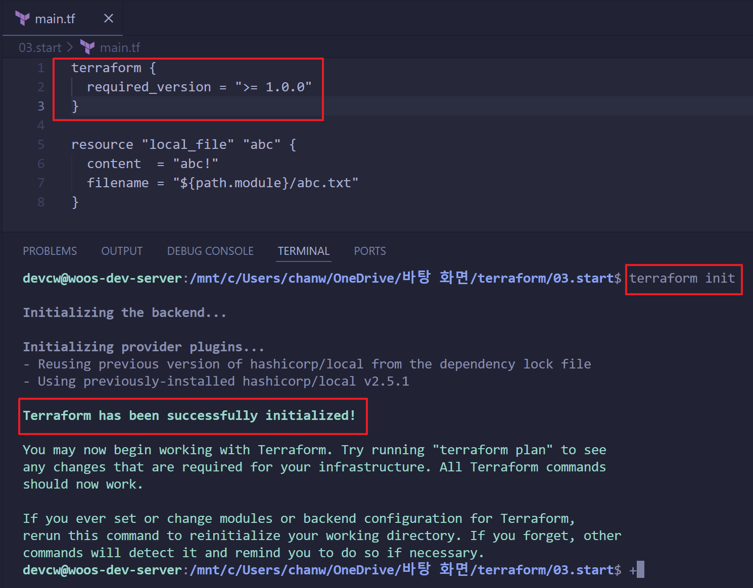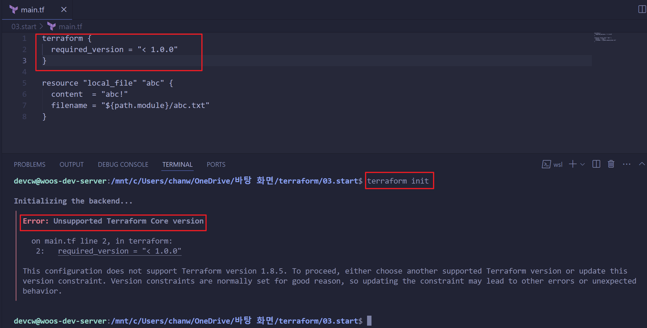 required_version์ผ๋ก ์ ์ด๋๋ ๋ฒ์ ์ ํ์ ํ์ธํด๋ณด๊ธฐ ์ํด main.tf์ terraform ๋ธ๋ก๊ณผ ๊ด๋ จ๋ ๊ฐ์ ์ถ๊ฐํด๋ณธ๋ค.