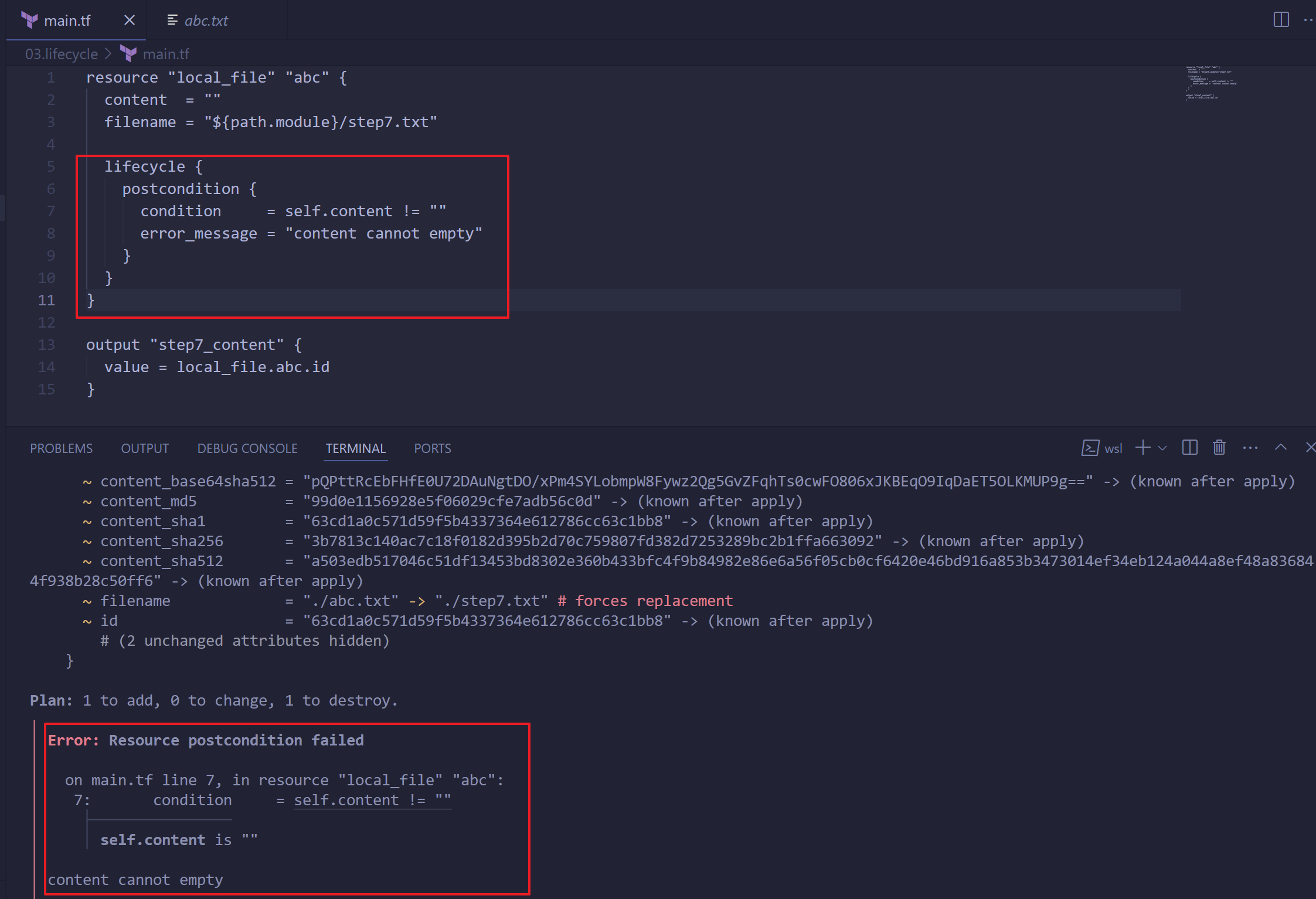 ์์ธ์? : ๊ธฐ์กด์ steb2 content๋ฅผ ์ง์ ํ์ฌ ์์ฑ์ด ๋์ด์๋ ์ํฉ์ด๋ค. ํ ๋ผํผ์ ์ ์ธ์ ์ธ ํน์ฑ์ ๊ฐ์ง๊ณ ์๊ธฐ ๋๋ฌธ์, ๋ฆฌ์์ค๋ฅผ ์ญ์ ํ๋ค๊ฐ ๋ค์ ์์ฑํ๋ ๊ฐ๋ ์ด๋ค. prevent_destory๋ฅผ ๋ช ์ํ์ฌ ์ญ์ ๋ฅผ ๋ฐฉ์งํ์๊ธฐ ๋๋ฌธ์, abc ํ์ผ์ด ์ญ์ ๋์ง ์์๊ฒ์ด๋ค. (ํ๋ ธ๋ค๋ฉด ์๋ ค์ฃผ์ธ์..)