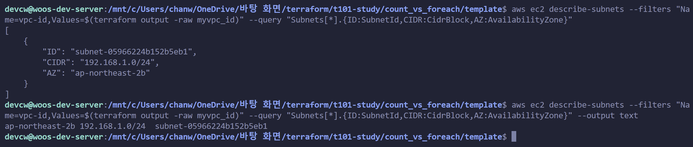 cidr_block = **var.subnets[count.index].cidr # elment์์ ๋ณ๊ฒฝ**