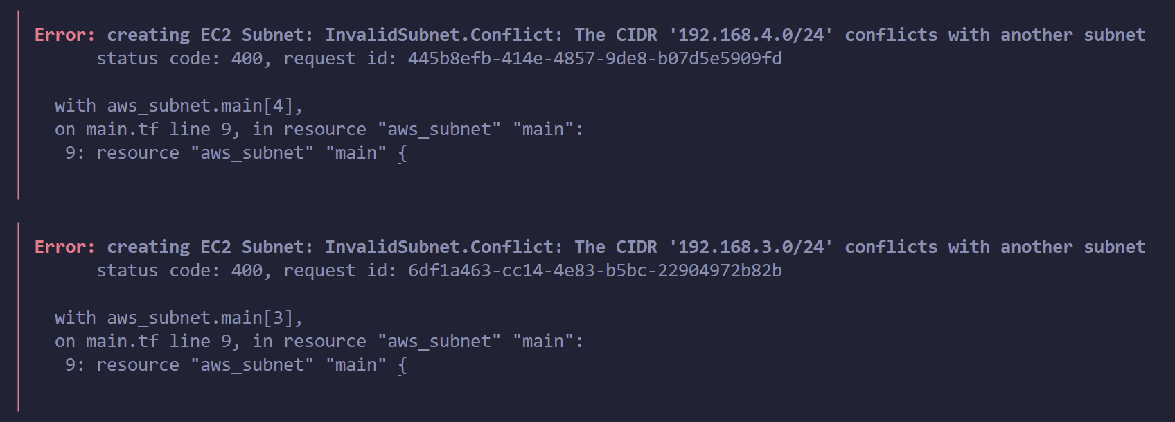 ์์ ํ์ฌ terraform apply ์งํ ์, ๋ค์๊ณผ ๊ฐ์ด ์๋ฌ๊ฐ ๋ฐ์ํ๋ค. 192.168.4.0/24, 192.168.3.0/24 ์๋ธ๋ท์ด ์ถฉ๋ํ๋ค๋ ๊ฒ์ธ๋ฐ ์ด์ ๊ฐ ๋ฌด์์ผ๊น?