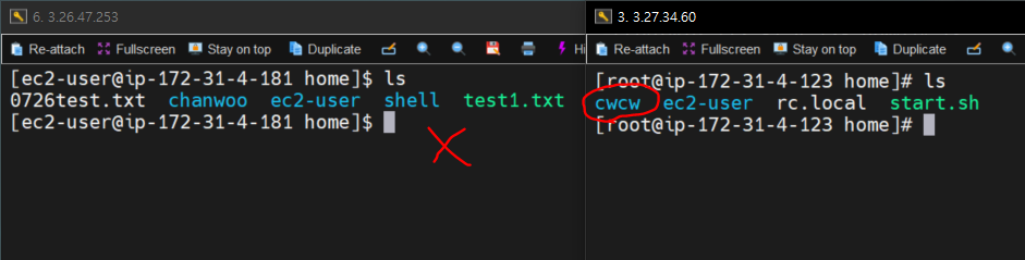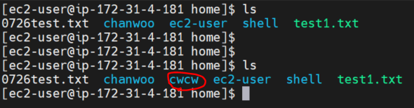 cwcw 디렉터리가 존재하지 않는 hosts server 2에 cwcw 디렉터리가 생성되면 성공한것이다.