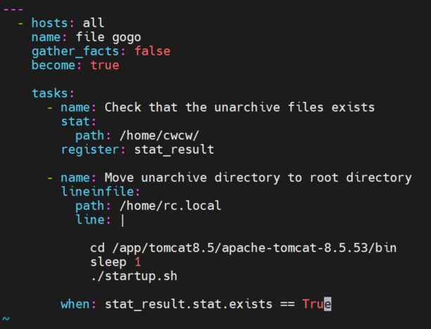 이걸로 when 조건문으로 lieninfile(파일 내용 추가 모듈)을 조건에 맞게 사용하는 실습을 완료하였다.