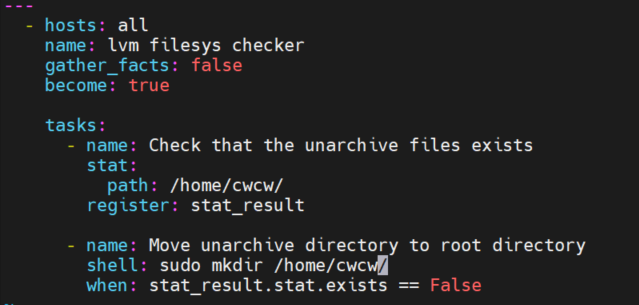 이번에는 when 조건문을 활용하여 조건이 참인 hosts에만 명령을 수행해보겠다.