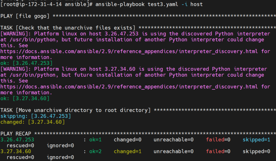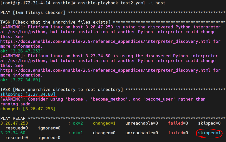 task 실행 결과 내용에 이미 cwcw가 존재하는 hosts 1은 skipped 된 것을 확인할 수 있다.