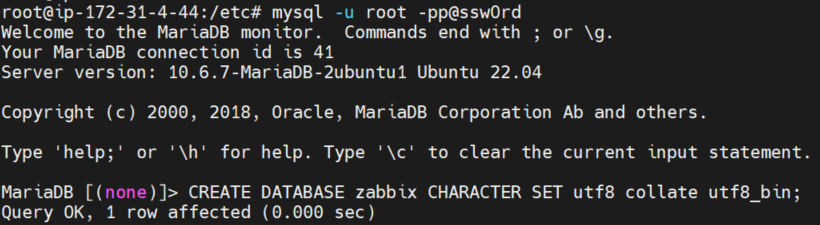 mysql> create database zabbix character set utf8mb4 collate utf8mb4_bin;
