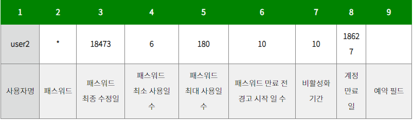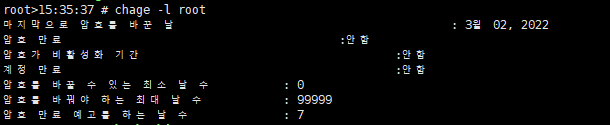 - W : 패스워드 만료 몇일 전부터 사용자에게 경고 메세지 발송 설정
