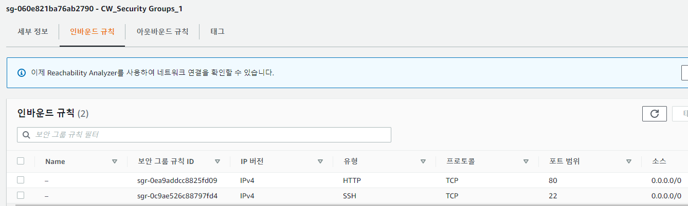 인바운드는 동일한 보안 그룹인 default에만 허용되어 있고, 아웃바운드는 모든 접속이 허용되어 있습니다.