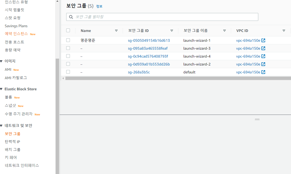 Group name 이 default인 것은 기본적으로 제공되는 보안 그룹이며,