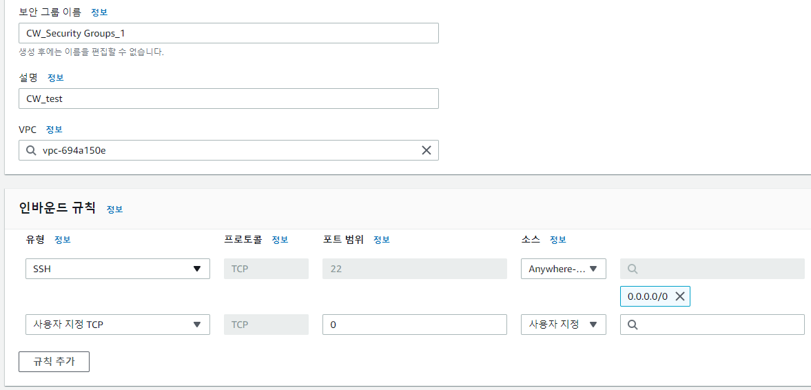 - Source : 기본값 그대로 Anywhere를 사용한다. Coustom IP를 선택하면 IP 주소 대역을 설정